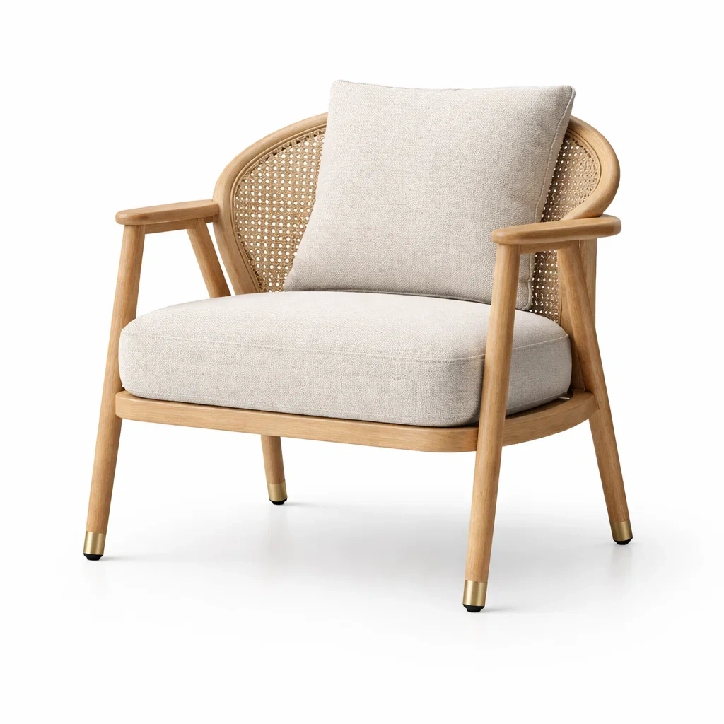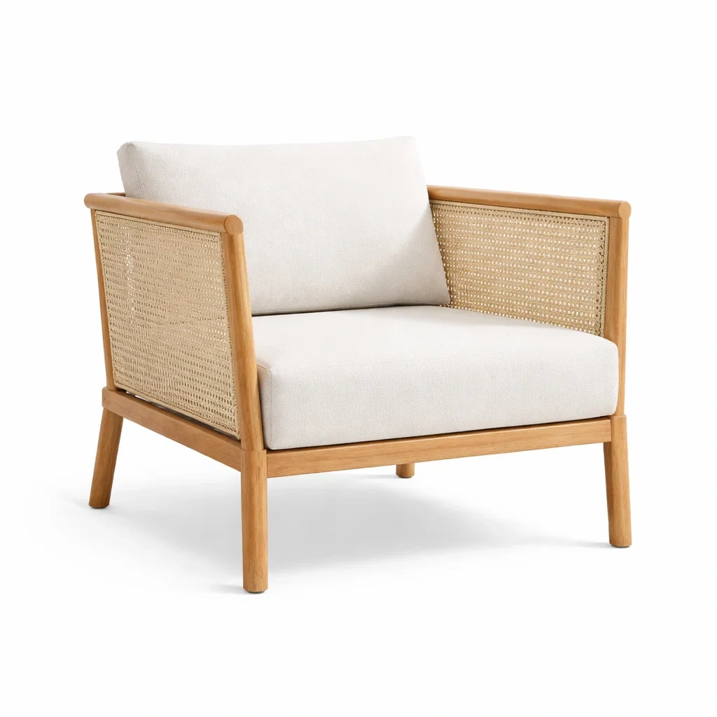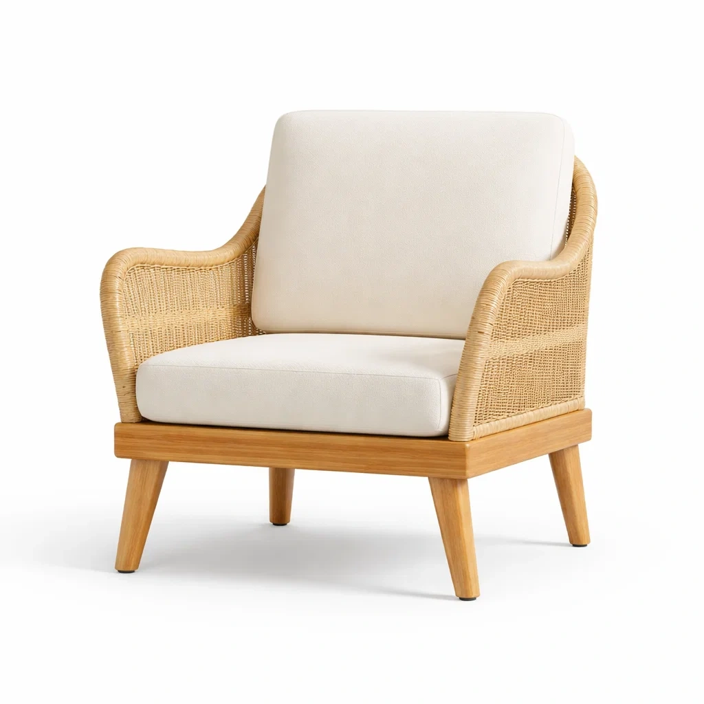 Fauteuil en chêne et rotin avec coussins en polyester beige