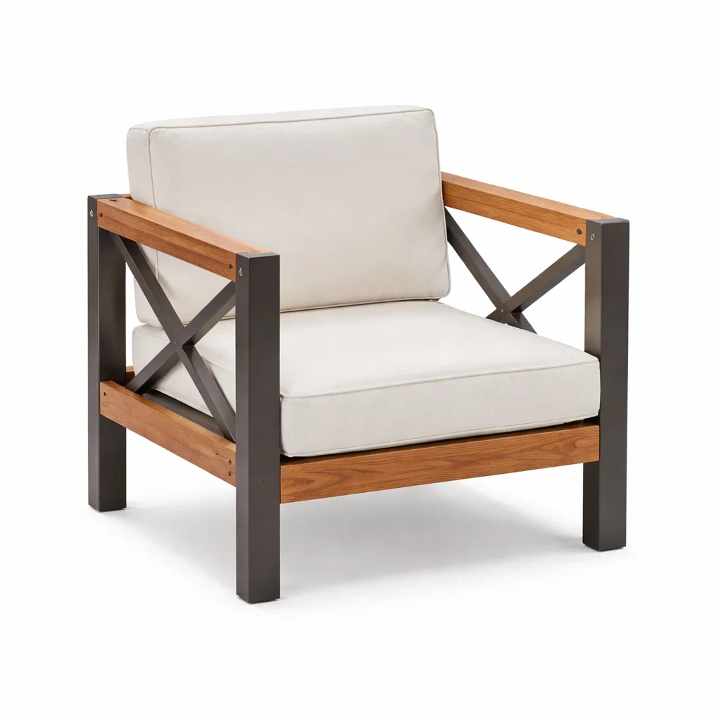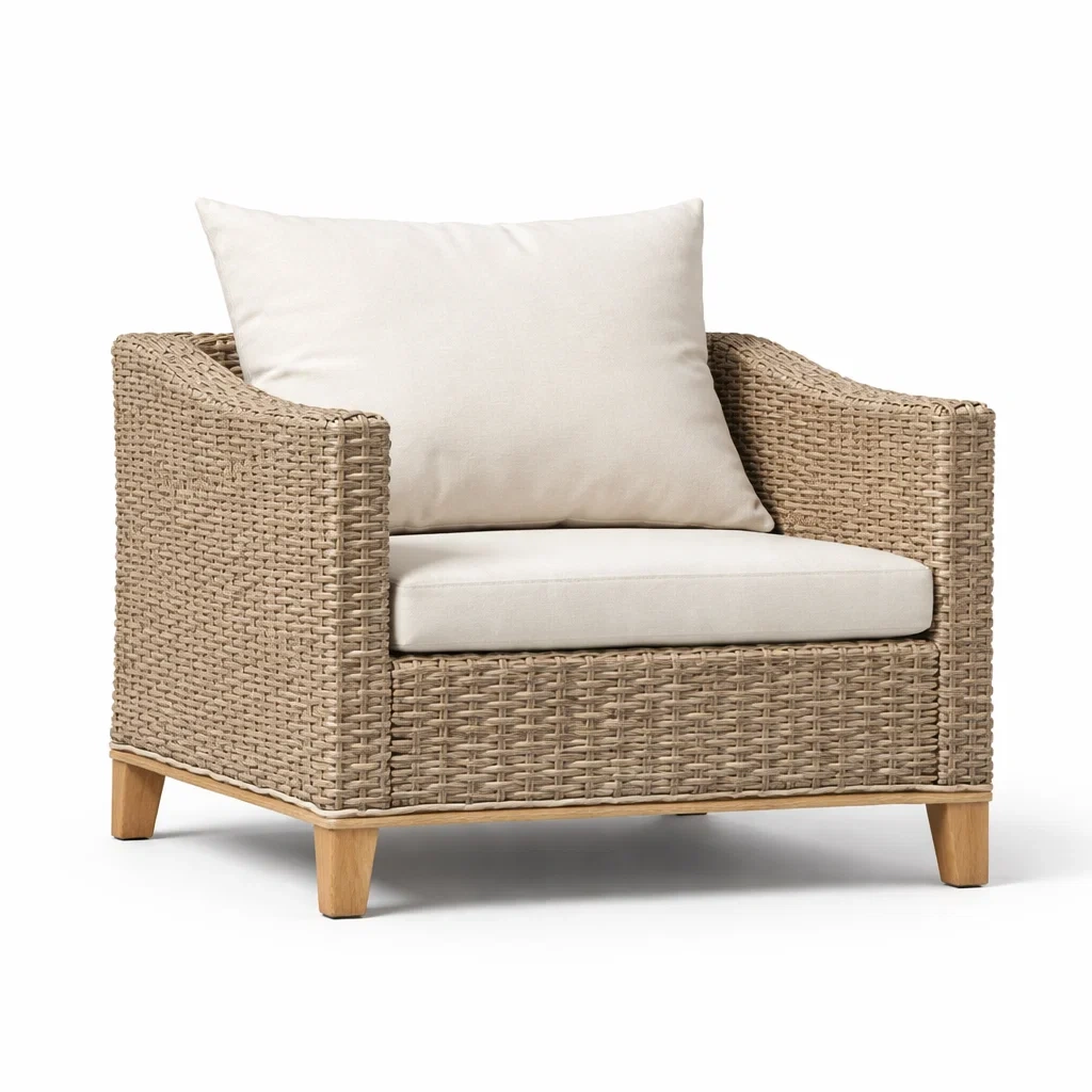 Fauteuil en rotin et bois avec coussins en tissu polyester beige