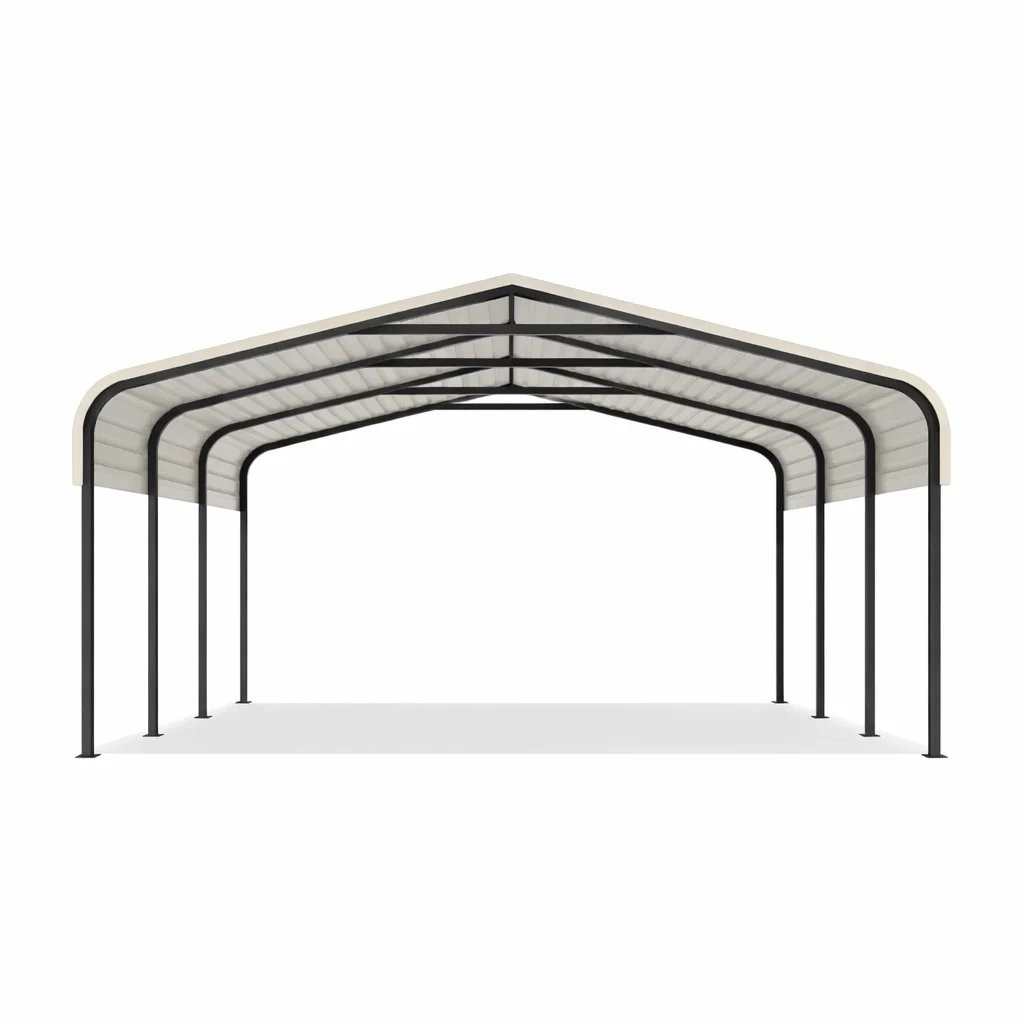 L'abri de voiture est fabriqué en acier avec une couverture en tôle d'acier galvanisé. Ses dimensions sont de 6 m de longueur, 3 m de largeur et 2,7 m de hauteur.