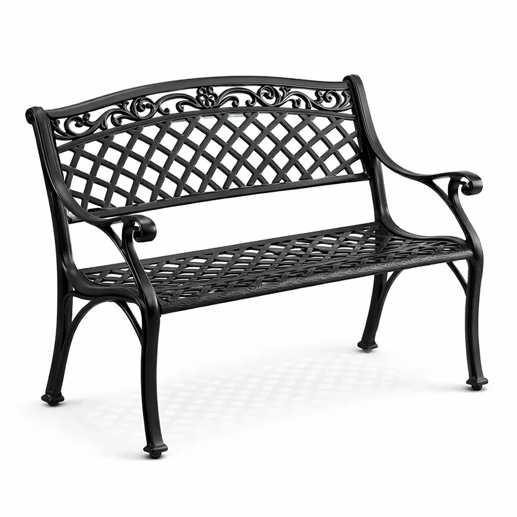 Le banc de jardin est fabriqué en aluminium moulé avec un dossier ornementé.