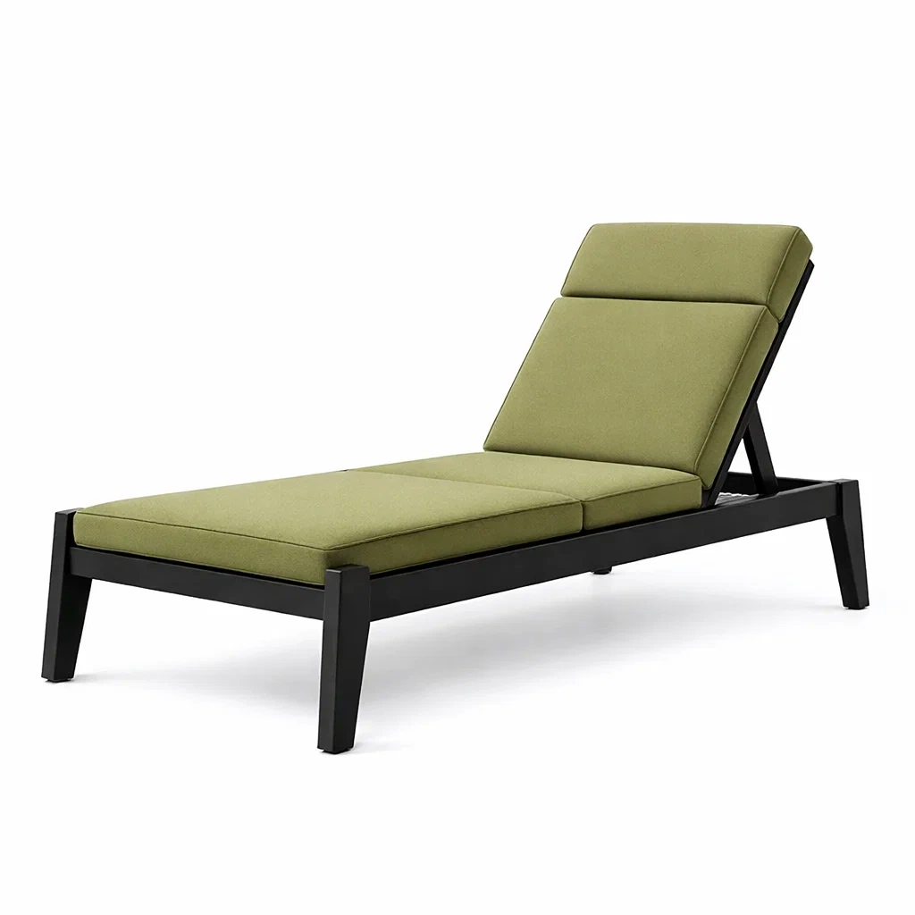Structure en aluminium avec coussins en tissu polyester vert. Le rembourrage est en mousse polyuréthane.
