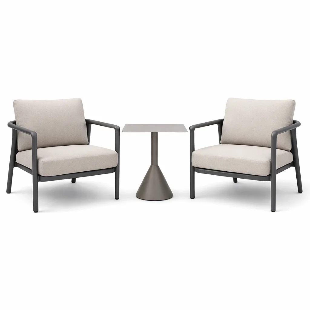 Cadre en aluminium avec revêtement en poudre assurant durabilité et résistance aux intempéries. Les coussins sont recouverts de tissu en polyester beige, garantissant confort et facilité d'entretien. Dimensions du fauteuil : 75 cm x 70 cm x 80 cm, capable de supporter jusqu'à 120 kg. La table basse en aluminium mesure 50 cm x 50 cm x 45 cm. Design moderne avec structure soudée.