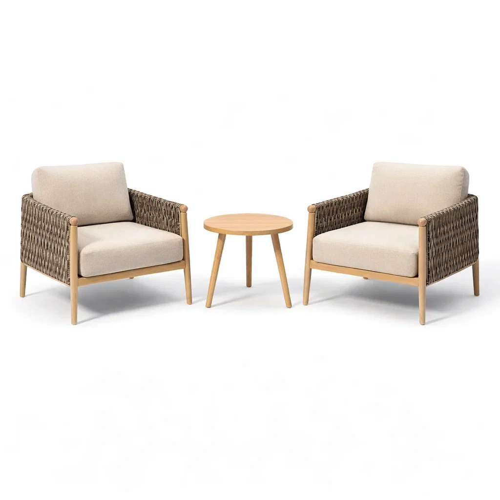 - Fauteuils : Structure en bois d'acacia, assises en polyester, accoudoirs en rotin synthétique