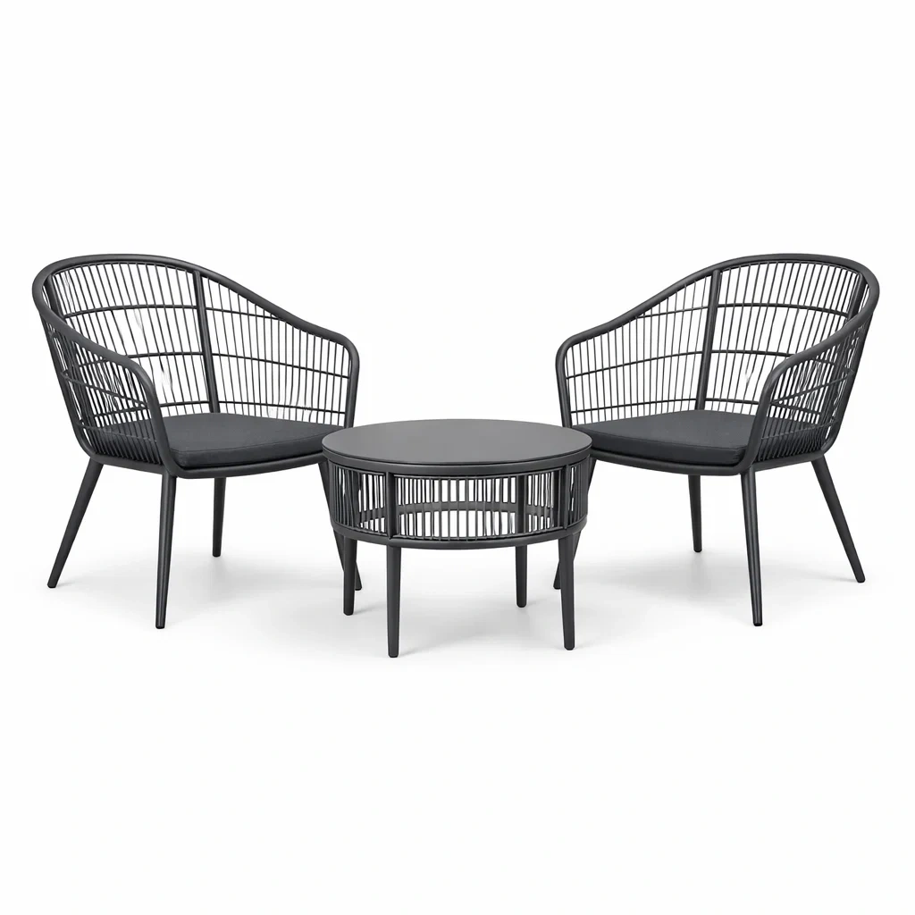 Cet ensemble comprend deux fauteuils avec une structure en acier et un revêtement en rotin synthétique, ainsi qu'une table avec un plateau en aluminium et une structure similaire. Les fauteuils mesurent 62 cm de largeur, 65 cm de profondeur et 72 cm de hauteur, avec une capacité de charge de 120 kg chacun. La table a un diamètre de 50 cm et une hauteur de 45 cm.