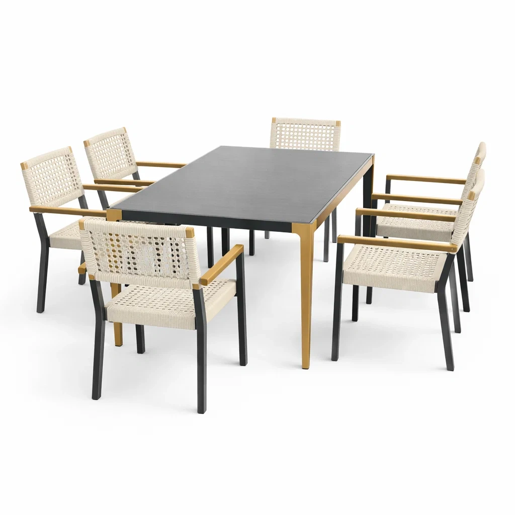 Ensemble table à manger et chaise 7 pièces en aluminium et polypropylène tressé noir et beige