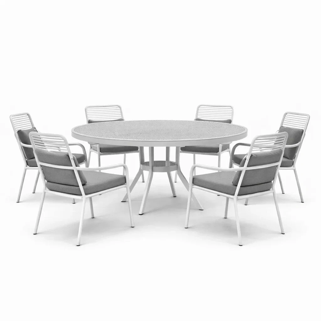 Table ronde en aluminium avec surface en résine tressée. Chaises en aluminium avec coussins en mousse recouverts de polyester. Taille de la table: diamètre de 180 cm, hauteur de 75 cm. Taille des chaises: hauteur de 85 cm, largeur de 60 cm, profondeur de 65 cm. Capacité de charge de la table: 80 kg. Capacité de charge de chaque chaise: 120 kg.