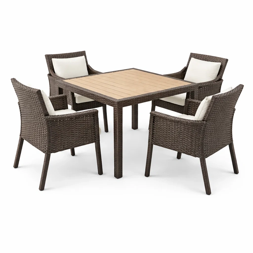 Ce set de meubles comprend une table carrée et quatre chaises avec coussins.