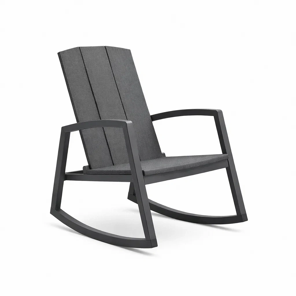 Chaise à bascule conçue pour l'extérieur avec une structure en métal et un revêtement en polyester. Dimensions : 90 cm de hauteur, 57 cm de largeur, 77 cm de profondeur. Poids total de 7.50 kg. Dossier ergonomique.
