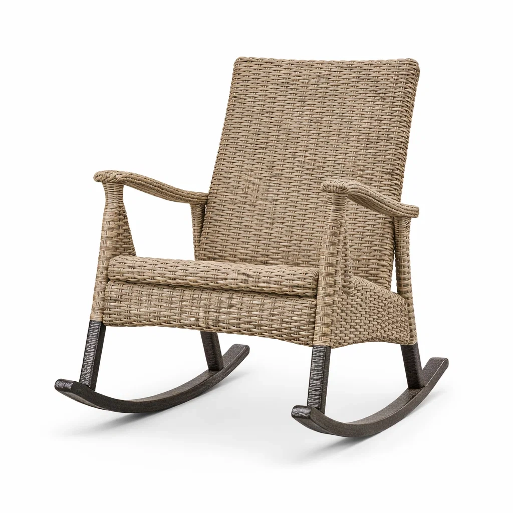 La chaise berçante est fabriquée en résine tressée avec un cadre en aluminium. Elle mesure 90 cm x 65 cm x 100 cm et pèse 8.5 kg.