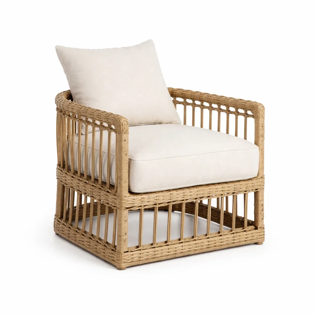 Ce fauteuil est fabriqué en rotin tressé avec un cadre solide et léger. Les coussins sont recouverts de tissu polyester beige avec un rembourrage en mousse.