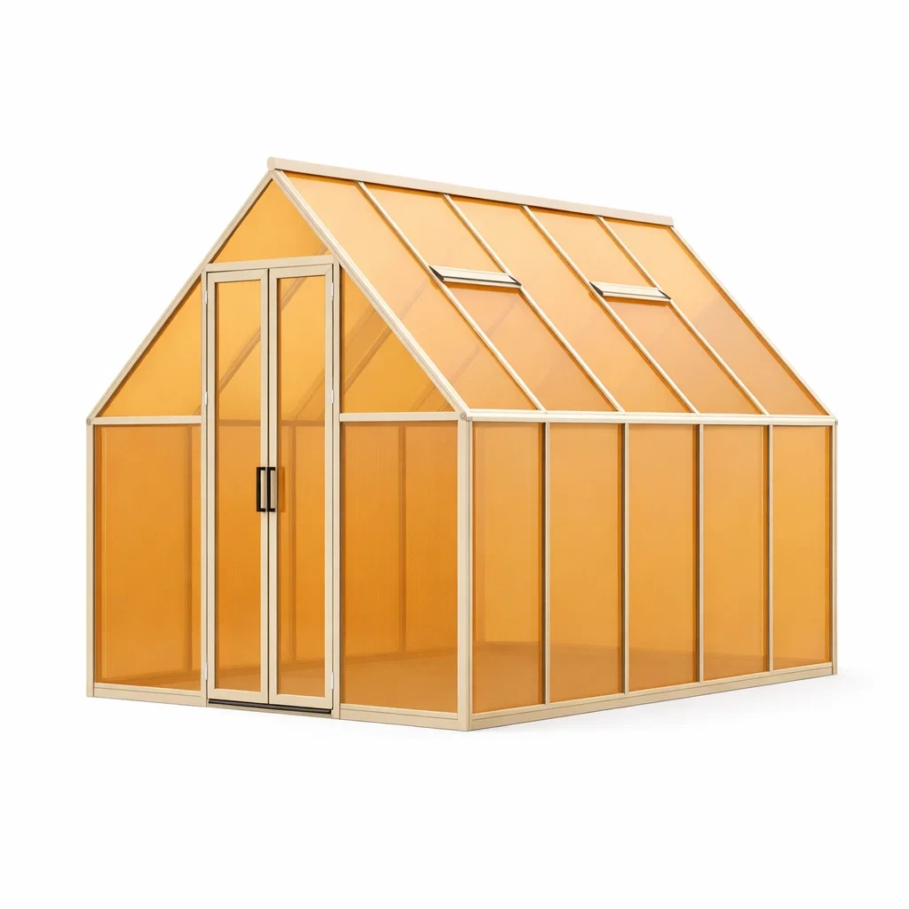 Cette serre est fabriquée en polycarbonate pour les parois et en aluminium pour le cadre, offrant une grande transparence et une bonne étanchéité. Les dimensions de la serre sont de 312 cm de long, 190 cm de large et 250 cm de haut. Les panneaux de polycarbonate ont une épaisseur de 4 mm, assurant une bonne isolation thermique. Elle est équipée de fenêtres de ventilation à double ouvrant pour optimiser l'aération interne.